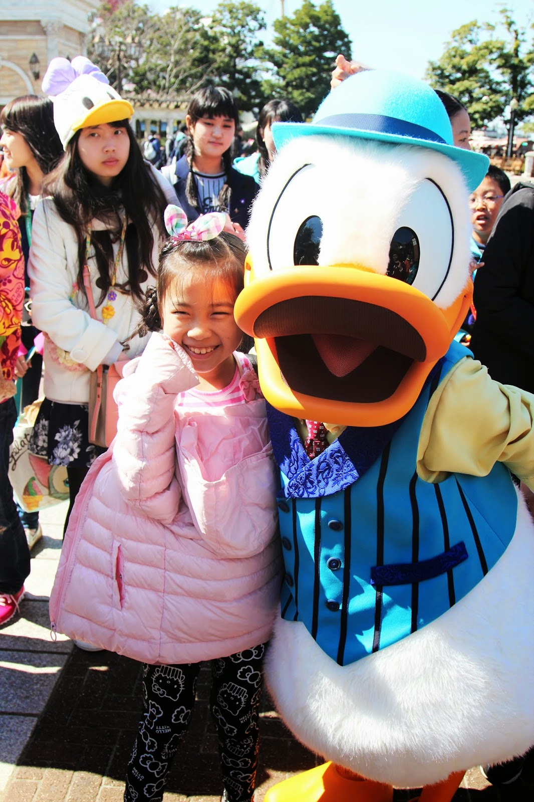打算改搭迪士尼海洋電氣化鐵路列車到發現港區,在一旁發現有卡通名星出沒,趕緊叫妮妮過來拍照;正要離去的唐老鴨,被妮妮抱著,擋路成功,順利的合照達成。